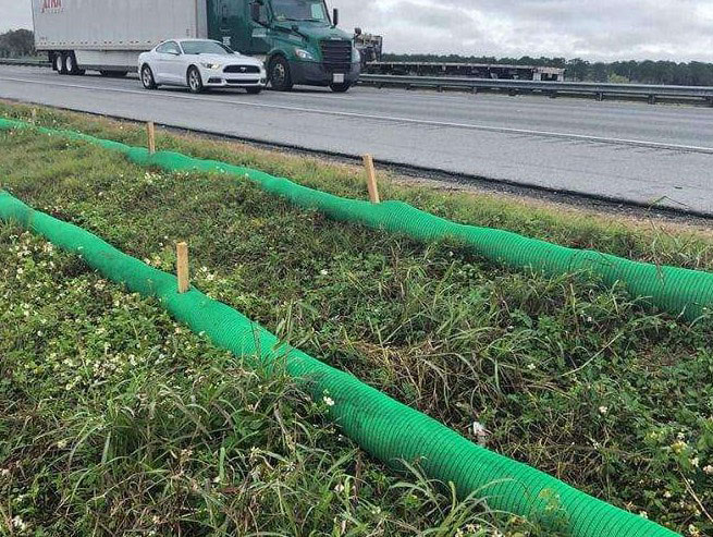 Compost Filter Sock is a durable woven fabric filled with composted mulch that is designed to redirect flow and filter out sediment and other contaminants from stormwater events.